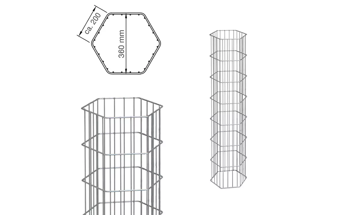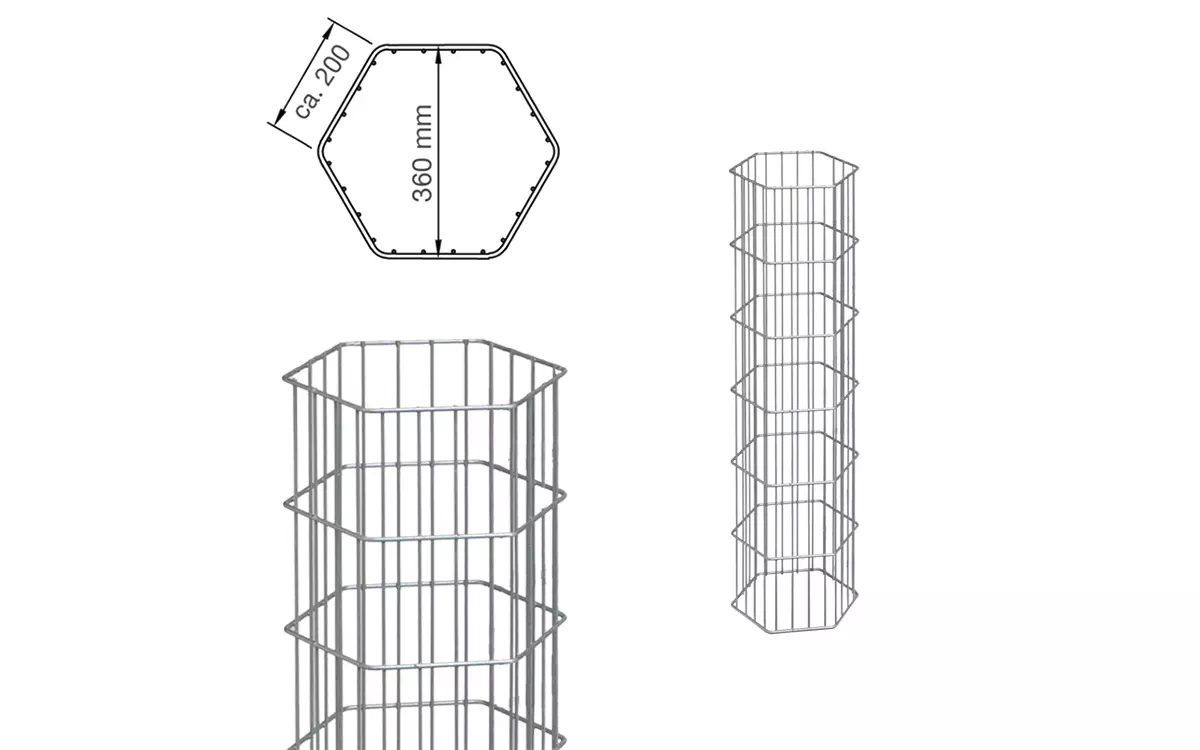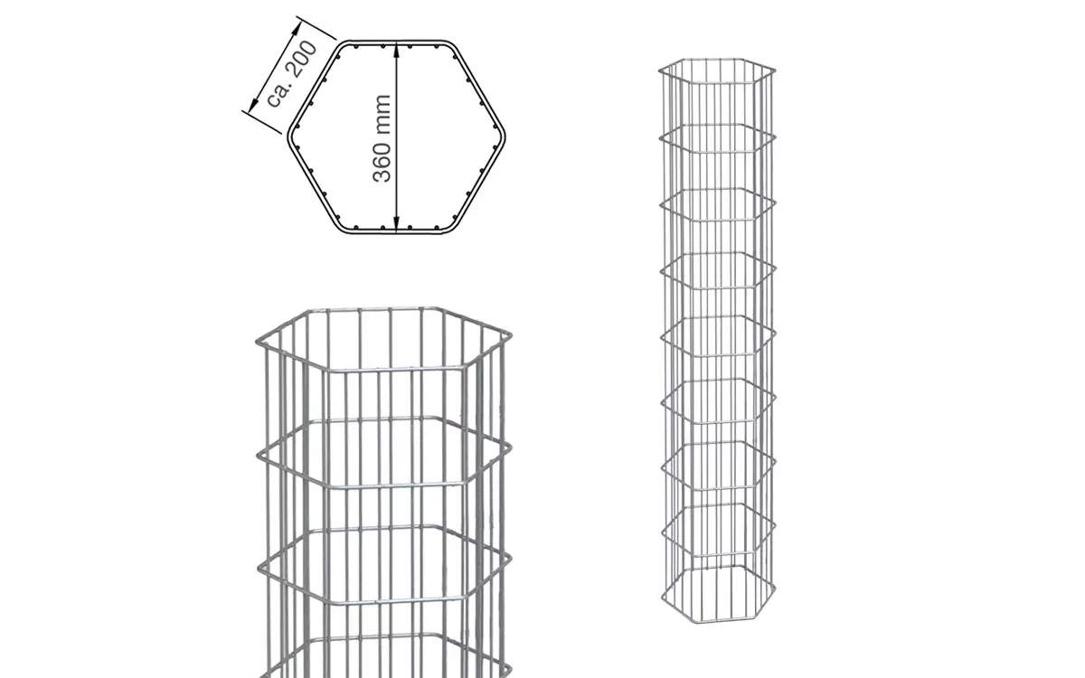 Technische Daten Säulenhöhe von 1000 mm – 2400 mm Maschenweite 50/200 mm architektonisch im Außen-/ Innenbereich feuerverzinkt oder verzinkt / pulverbeschichtet in RAL7016 (anthrazit) Tiefe = 360 mm Kantenlänge 200 mm Die Gabionen-Säule ONYX besticht durch ihre sechseckige Form und ist individuell einsetzbar und befüllbar. Sie ist in der Tiefe von 360 mm, einer Kantenlänge von 200 mm und in Höhen von 1000 mm bis 2400 mm zu bekommen. Die Gabionen-Säule wird in einem Stück gewickelt und mit den Schweißpunkten zwischen jedem waagerechten Draht dauerhaft verschlossen und kann mit Kieseln, Alpensteinen, Sandstein, Grobschlag, dunkelbraunem oder türkisen Glas befüllt werden. Gabionensäulen werden entweder einbetoniert oder auf ein Fundament mit Fußplatte aufgedübelt. Idealerweise werden die Säulen 60 cm tief einbetoniert, dementsprechend hoch sollte die Säule gewählt werden. ONYX bietet Ihnen den höchsten Korrosionsschutz durch Feuerverzinkung im Tauchbad nach EN ISO 1461 und bei den RAL Farben durch zusätzliche Pulverbeschichtung. Bei einer feuerverzinkten Gabionen-Säule kann man bei normalen Witterungsbedingungen davon ausgehen, dass es 30 Jahre dauert, bis die schützende Zinkschicht abgetragen ist. Sind die Gabionen-Säulen zusätzlich in RAL Farben kunststoffbeschichtet, erhöht sich der Schutz um viele weitere Jahre. Einsatzbeispiele zur Einfriedung des Grundstücks als Terrassen-Trennwand als Sicht- und Windschutz im Außenbereich als Carport-Umkleidung als Abgrenzung für Mülltonnenstellplätze architektonisch im Außen-/ Innenbereich Säulen und Steinfüllungen der Gabionen-Zaunsysteme lassen sich individuell kombinieren – der Kreativität sind keine Grenzen gesetzt: ob solitär als Dekoration im Außenbereich, als Pfosten für Holzelemente, Doppelstab- oder Sichtschutzgitter oder in Verbindung mit zwei parallel laufenden Gittern als Steinwand.