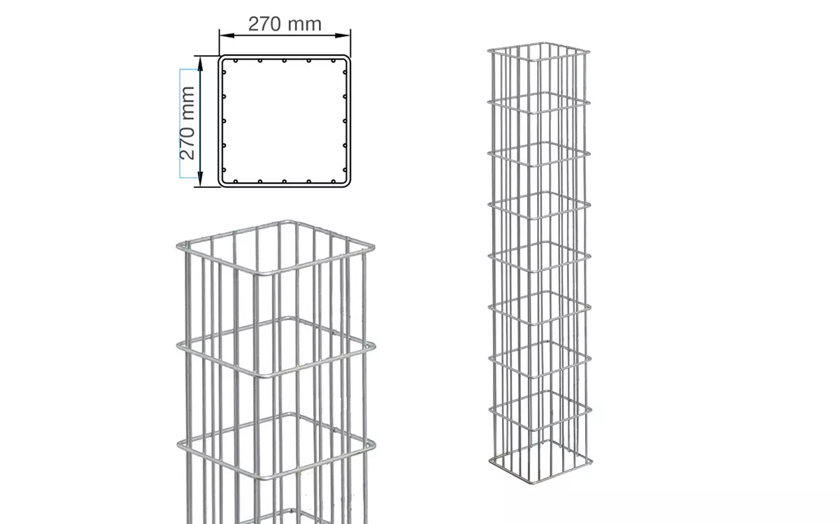 Technische Daten Breiten: 220 mm und 270 mm Säulenhöhe von 1000 mm – 2400 mm Maschenweite 50/200 mm architektonisch im Außen-/ Innenbereich feuerverzinkt oder verzinkt / pulverbeschichtet in RAL7016 (anthrazit) Die Gabionen-Säule RUBIN ist kreativ, schick und sehr individuell einsetzbar und befüllbar. Sie ist in Tiefen von 220 mm und 270 mm und in Höhen von 800 mm bis 2400 mm zu bekommen. Die Gabionen-Säule wird in einem Stück gewickelt und mit den Schweißpunkten zwischen jedem waagerechten Draht dauerhaft verschlossen und kann mit Kieseln, Alpensteinen, Sandstein, Grobschlag, dunkelbraunem oder türkisen Glas befüllt werden. Gabionensäulen werden entweder einbetoniert oder auf ein Fundament mit Fußplatte aufgedübelt. Idealerweise werden die Säulen 60 cm tief einbetoniert, dementsprechend hoch sollte die Säule gewählt werden. RUBIN bietet Ihnen den höchsten Korrosionsschutz durch Feuerverzinkung im Tauchbad nach EN ISO 1461 und bei den RAL Farben durch zusätzliche Pulverbeschichtung. Bei einer feuerverzinkten Gabionen-Säule kann man bei normalen Witterungsbedingungen davon ausgehen, dass es 30 Jahre dauert, bis die schützende Zinkschicht abgetragen ist. Sind die Gabionen-Säulen zusätzlich in RAL Farben kunststoffbeschichtet, erhöht sich der Schutz um viele weitere Jahre. Einsatzbeispiele zur Einfriedung des Grundstücks als Terrassen-Trennwand als Sicht- und Windschutz im Außenbereich als Carport-Umkleidung als Abgrenzung für Mülltonnenstellplätze architektonisch im Außen-/ Innenbereich Säulen und Steinfüllungen der Gabionen-Zaunsysteme lassen sich individuell kombinieren – der Kreativität sind keine Grenzen gesetzt: ob solitär als Dekoration im Außenbereich, als Pfosten für Holzelemente, Doppelstab- oder Sichtschutzgitter oder in Verbindung mit zwei parallel laufenden Gittern als Steinwand.
