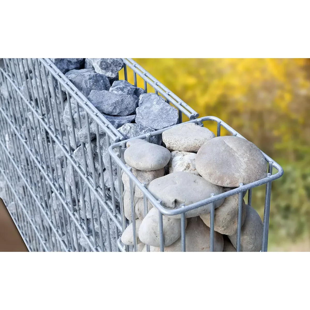 Die Gabionensäule RUBIN Q ist aus feuerverzinktem Stahlgewebe gefertigt, was für zusätzlichen Korrosionsschutz sorgt und die Lebensdauer verlängert.