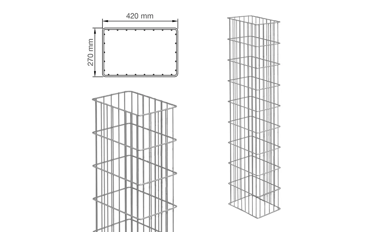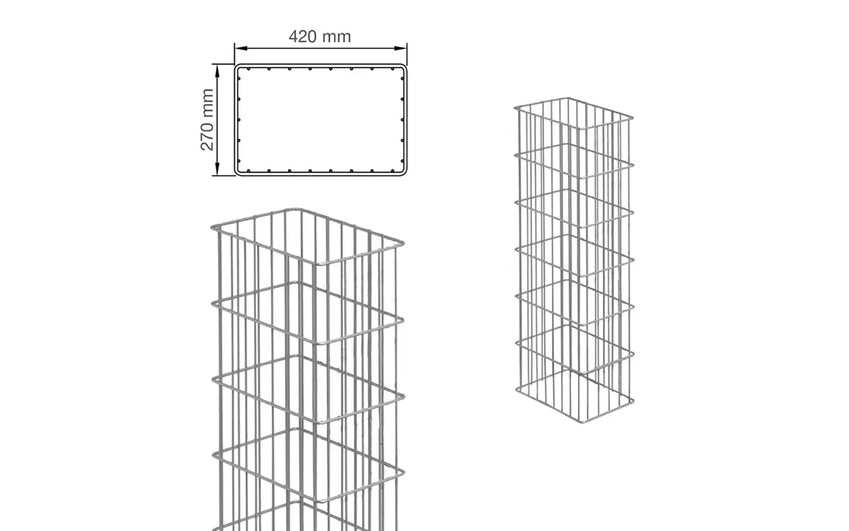 Technische Daten Breite / Tiefe: 270 mm / 420 mm Säulenhöhe von 1000 mm – 2400 mm Maschenweite 50/200 mm architektonisch im Außen-/ Innenbereich feuerverzinkt oder verzinkt / pulverbeschichtet in RAL7016 (anthrazit) Die Gabionen-Säule RUBIN R ist kreativ, schick und sehr individuell einsetzbar und befüllbar. Sie ist in Tiefen von 220 mm und einer Breite von 420 mm und in Höhen von 800 mm bis 2400 mm zu bekommen. Die Gabionen-Säule wird in einem Stück gewickelt und mit den Schweißpunkten zwischen jedem waagerechten Draht dauerhaft verschlossen und kann mit Kieseln, Alpensteinen, Sandstein, Grobschlag, dunkelbraunem oder türkisen Glas befüllt werden. Gabionensäulen werden entweder einbetoniert oder auf ein Fundament mit Fußplatte aufgedübelt. Idealerweise werden die Säulen 60 cm tief einbetoniert, dementsprechend hoch sollte die Säule gewählt werden. RUBIN R bietet Ihnen den höchsten Korrosionsschutz durch Feuerverzinkung im Tauchbad nach EN ISO 1461 und bei den RAL Farben durch zusätzliche Pulverbeschichtung. Bei einer feuerverzinkten Gabionen-Säule kann man bei normalen Witterungsbedingungen davon ausgehen, dass es 30 Jahre dauert, bis die schützende Zinkschicht abgetragen ist. Sind die Gabionen-Säulen zusätzlich in RAL Farben kunststoffbeschichtet, erhöht sich der Schutz um viele weitere Jahre. Einsatzbeispiele zur Einfriedung des Grundstücks als Terrassen-Trennwand als Sicht- und Windschutz im Außenbereich als Carport-Umkleidung als Abgrenzung für Mülltonnenstellplätze architektonisch im Außen-/ Innenbereich Säulen und Steinfüllungen der Gabionen-Zaunsysteme lassen sich individuell kombinieren – der Kreativität sind keine Grenzen gesetzt: ob solitär als Dekoration im Außenbereich, als Pfosten für Holzelemente, Doppelstab- oder Sichtschutzgitter oder in Verbindung mit zwei parallel laufenden Gittern als Steinwand.
