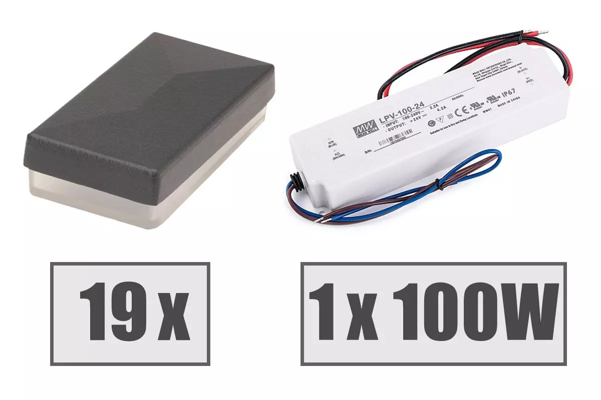 LED Zaunbeleuchtung und Trafo-Set – 1 St – 060×040 – 7016 LED-Zaunbeleuchtung für Zaunpfosten 60×40 mm Trafo mit passender Leistung zur Menge der LED-Pfostenkappen Maße (LxBxH) 94x50x25 mm UV-beständige Polycarbonatdiffusorscheibe Leuchtmittel (LED) integriert, nicht austauschbar Lichtfarbe neutralweiß Lichtstrom 200 Lumen, dimmbar, Nennspannung 24 Volt, Nennleistung 3 Watt Schutzart IP65, Schutzklasse III, Energieeffizienzklasse A++ Aluminiumgehäuse, pulverbeschichtet Anthrazitgrau (RAL 7016) 1x LED Zaunbeleuchtung – Trafo – 20W Nominelle Ausgangsspannung 24,0V Strom max. 0,84A, Leistung max. 20,0W Abmessung (LxBxH) 140x30x22 mm Spannung nicht einstellbar am Gerät und von extern Wirkungsgrad 83.0% Restwelligkeit 150mV Spannung Eingang min. 90V AC / 127V DC, max. 264V AC / 370V DC Arbeitstemperatur min. -30C°, max. 70C° Einschaltstrom bei 230V AC ist 70A Anschluss Eingang/Ausgang: open-wire 1x LED Zaunbeleuchtung – Trafo – 35W Nominelle Ausgangsspannung 24,0V, Strom max. 1,50A, Leistung max. 35,0W, Abmessung (LxBxH) 84x57x30 mm, Spannung nicht einstellbar am Gerät und von extern, Wirkungsgrad 84.0%, Restwelligkeit 180mV, Spannung Eingang min. 90V AC / 127V DC, max. 264V AC / 370V DC, Arbeitstemperatur min. -30C°, max. 70C°, Einschaltstrom bei 230V AC ist 45A, Anschluss Eingang/Ausgang: open-wire 1x LED Zaunbeleuchtung – Trafo – 60W Nominelle Ausgangsspannung 24,0V, Strom max. 2,50A, Leistung max. 60,0W, Abmessung (LxBxH) 162x42x32 mm, Spannung nicht einstellbar am Gerät und von extern, Wirkungsgrad 86.0%, Restwelligkeit 150mV, Spannung Eingang min. 90V AC / 127V DC, max. 264V AC / 370V DC, Arbeitstemperatur min. -30C°, max. 70C°, Einschaltstrom bei 230V AC ist 60A, Anschluss Eingang/Ausgang: open-wire 1x LED Zaunbeleuchtung – Trafo – 100W Nominelle Ausgangsspannung 24,0V, Strom max. 4,30A, Leistung max. 100,0W, Abmessung (LxBxH) 190x52x37 mm, Spannung nicht einstellbar am Gerät und von extern, Wirkungsgrad 88.0%, Restwelligkeit 150mV, Spannung Eingang min. 90V AC /