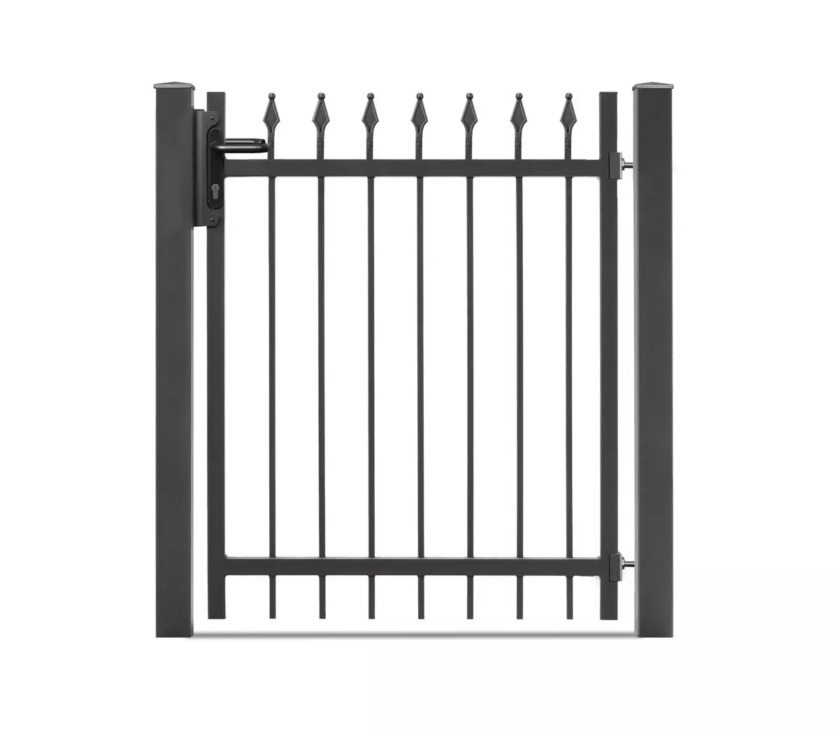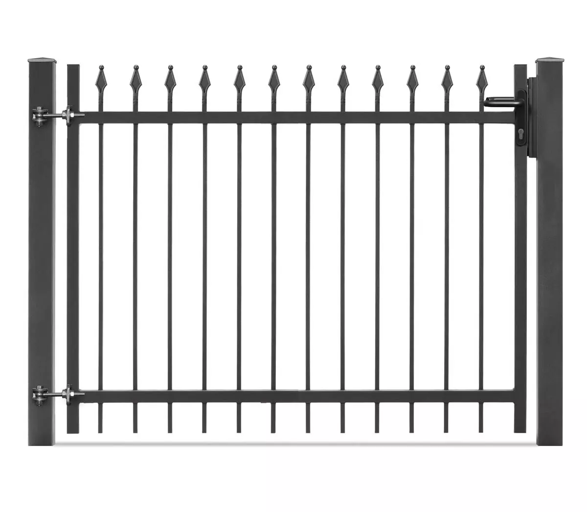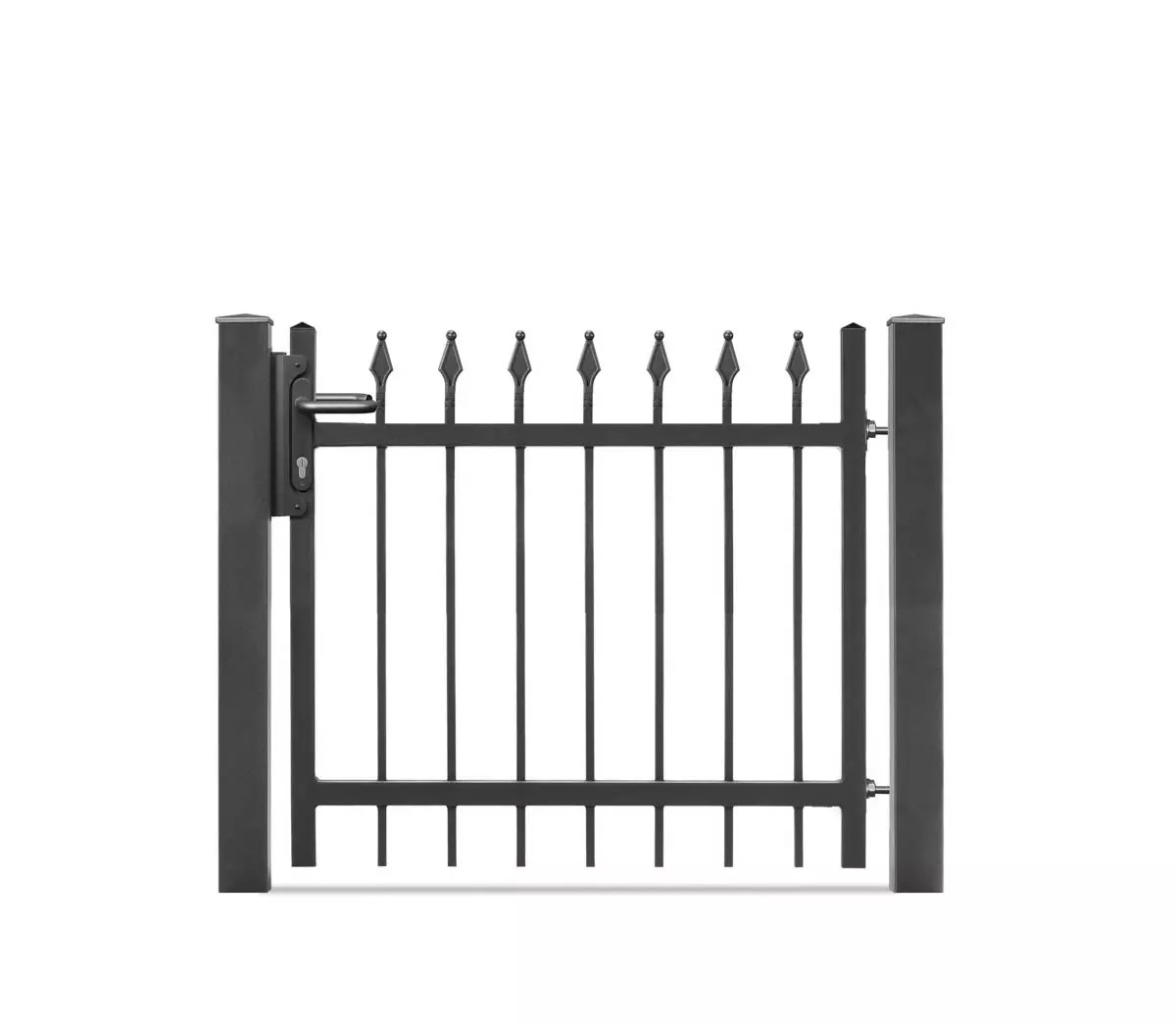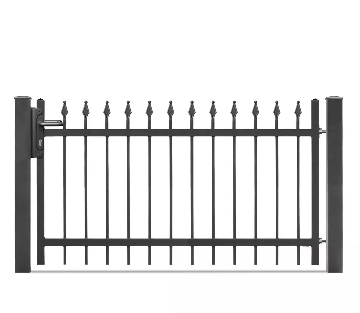 Drehflügeltor – Residenzen select + ZERMATT Torhöhe: 900mm -1200 mm Variante: 1-flügelige Toranlage Öffnungsrichtung: 90°: Lichte Weite: 1065mm Öffnungsrichtung: 180°: Lichte Weite: 1055mm Füllung: Schmuckzaun ZERMATT+ mit Spitzen-Ornamenten Farbe: feuerverzinkt und hochwertig mit DB703 Eisenglimmer pulverbeschichtet Torpfosten: Quadratrohr 80/80mm, Antrieb: Manuell, Zaunanschluss: Optional inklusive passendem Zubehör-Set Das Schmucktor VARIO Residenz select / select+ ZERMATT mit den klassischen Zierspitzen ist das passende Tor zu unserem Zaunmodell Residenzen select+ ZERMATT. Es ist in zwei Breiten und zwei Höhen als 1-flügelige Variante erhältlich. Als Einfahrtstor stehen die 2-flügelige Varianten mit den Lichten Weite von 3215 mm und 2095 mm (90° Öffnungswinkel) zur Auswahl. Alle Tore sind feuerverzinkt und hochwertig mit DB703 eisenglimmer pulverbeschichtet. Das garantiert eine langlebige Qualität.