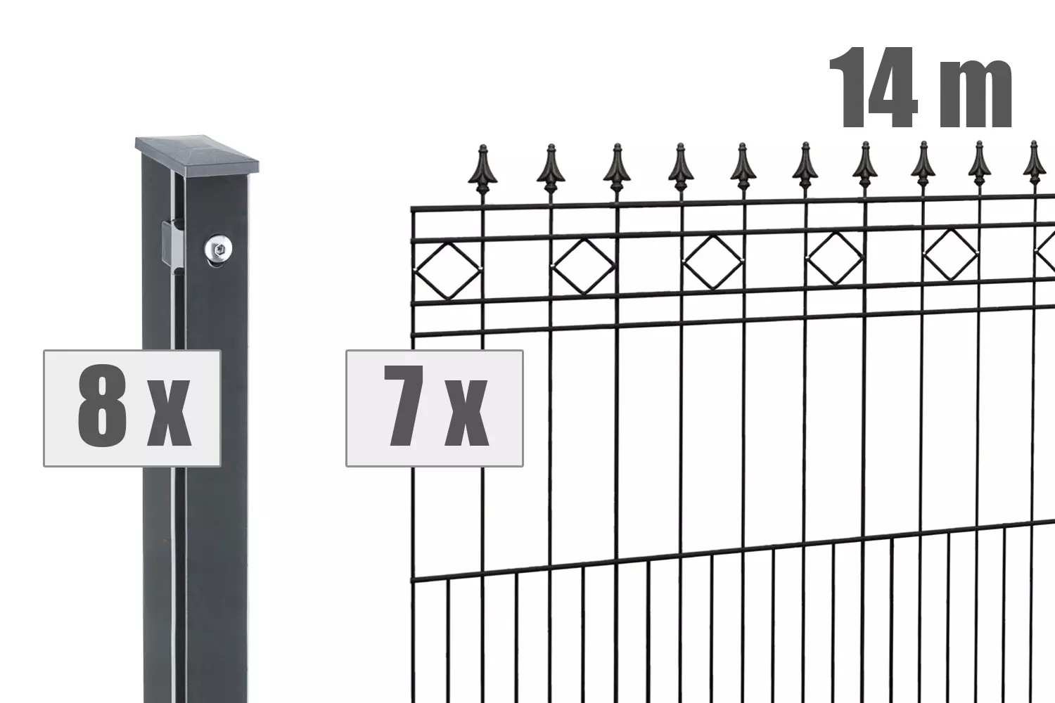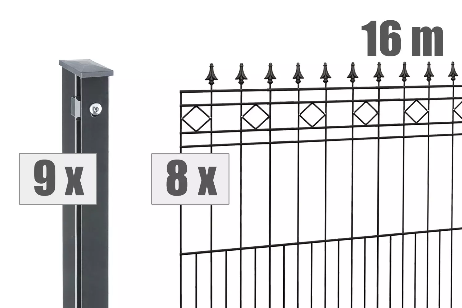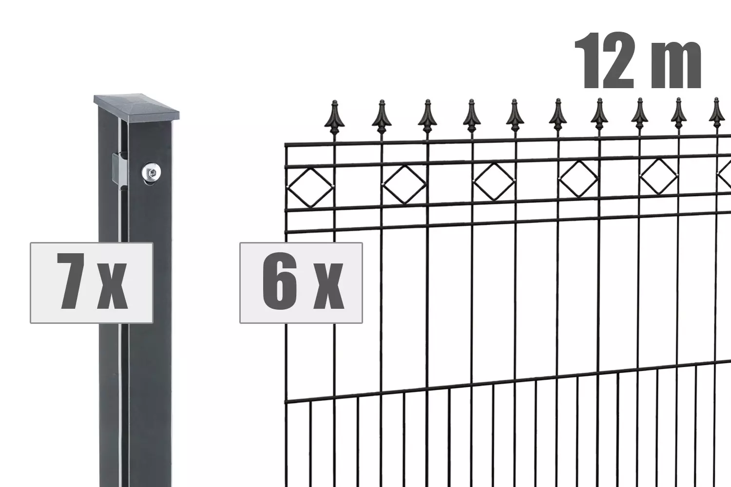 Zaunlänge: 1914 mm vertikale Rundstäbe: 6 mm U-Profil 20 x 09 mm inkl. Pfosten TYP VAP Leicht, preiswert und vielseitig einsetzbar – das sind die Merkmale des Schmuckzauns RIMINI. RIMINI überzeugt durch die auffälligen Rauten-Ornamente mit aufgesetzten Spitzen, die dem Zaun eine zeitlose, klassische Optik verleihen. RIMINI wird mit modernster Schweißtechnik gefertigt. Feuerverzinkung und hochwertige Pulverbeschichtung garantieren eine außerordentlich lange Lebensdauer. Der Schmuckzaun RIMINI ist in der Farbe anthrazitgrau (RAL 7016) erhältlich. Als Höhen stehen 0.9 m und 1.1 m zur Verfügung. Darüber hinaus sind auch passende einflügelige Gartentore erhältlich. Selbstverständlich sind die Zäune der Serie Zaunpake KOMPLETT einfach zu montieren. >> Montageanleitung