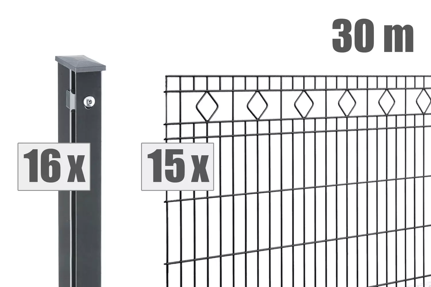 Technische Daten: Gitterlänge: 1910 mm Höhen von 806 mm bis 2006 mm Drahtstärke 6/5/6 inkl. Pfosten TYP VAP Maschenweite 50/200 Farbe/Oberfläche: verzinkt und pulverbeschichtet Das Modell MALAGA ist ein moderner und gleichzeitig exklusiver Schmuckzaun mit rautenförmigen Ornamenten im obersten Segment. Oberfläche/ Farbe: MALAGA wird mit modernster Schweißtechnik gefertigt. Feuerverzinkung und hochwertige Pulverbeschichtung garantieren eine außerordentlich lange Lebensdauer. Erhältlich ist das Modell ausschließlich in verzinkt und pulverbeschichtet (RAL7016, Anthrazitgrau). Weitere Farben und Größen erhalten Sie bei uns auf Anfrage. Bitte kontaktieren Sie hierzu sowie bei allen anderen Fragen gerne unsere Verkäufer. Diese beraten Sie kompetent und unverbindlich in allen Fragen rund um Ihre neue Zaunanlage! Selbstverständlich sind die Zäune der Serie Zaunpakete KOMPLETT einfach zu montieren. >> Montageanleitung