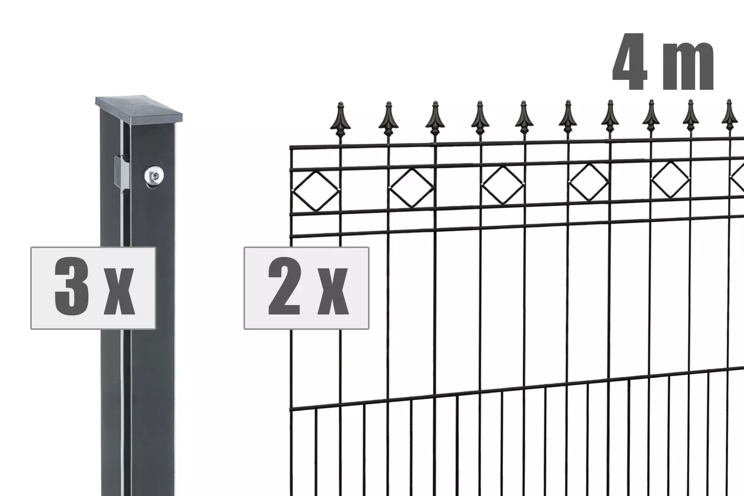 Zaunlänge: 1914 mm vertikale Rundstäbe: 6 mm U-Profil 20 x 09 mm inkl. Pfosten TYP VAP Leicht, preiswert und vielseitig einsetzbar – das sind die Merkmale des Schmuckzauns RIMINI. RIMINI überzeugt durch die auffälligen Rauten-Ornamente mit aufgesetzten Spitzen, die dem Zaun eine zeitlose, klassische Optik verleihen. RIMINI wird mit modernster Schweißtechnik gefertigt. Feuerverzinkung und hochwertige Pulverbeschichtung garantieren eine außerordentlich lange Lebensdauer. Der Schmuckzaun RIMINI ist in der Farbe anthrazitgrau (RAL 7016) erhältlich. Als Höhen stehen 0.9 m und 1.1 m zur Verfügung. Darüber hinaus sind auch passende einflügelige Gartentore erhältlich. Selbstverständlich sind die Zäune der Serie Zaunpake KOMPLETT einfach zu montieren. >> Montageanleitung