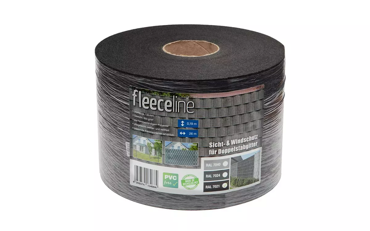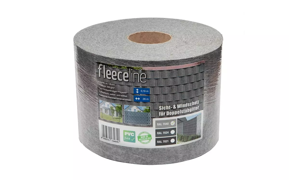 Pflegeleichte und wetterfeste Sicht- und Windschutz Rolle fleeceline Rollenlänge: 26m Streifenhöhe: 190mm Materialstärke: ~1,5 mm Abdeckfläche: ca. 5m² aus formbeständigen Polyester Farben: ähnlich RAL7040 (Fenstergrau), RAL7024 (Graphitgrau) und RAL7021 (Schwarzgrau) Mit dem hochwertigen und umweltfreundlichen Sichtschutzstreifen aus formbeständigem Polyester, schaffen Sie eine hochwertige Optik sowohl von Innen als auch von außen. Der blickdichte Sichtschutz ermöglicht eine ungestörte Privatsphäre und schont dabei noch die Umwelt, da dieser aus 101 PET-Flaschen nachhaltig verarbeitet wird. Die einfarbigen Streifen sind in einer Rolle mit einer Länge von ca. 26m und einer Höhe von 19cm erhältlich. Eine Rolle reicht für einen Standard -Doppelstabgitterzaun in einer Höhe von 2m und einer Breite von 2,50m. Passend dazu empfehlen wir Ihnen: 1) Zur Fixierung und Abschlussbildung des Sichtschutzes empfehlen wir unsere Klemmschienen mit dazu zu bestellen. 2) Um Ihnen noch mehr Stabilität im Pfosten bieten zu können, empfehlen wir bei jedem Einsatz von Sichtschutzprodukten unser bewährtes Pfostenverstärkungsprofil. 3) Zur Abdeckung des Spaltes im Doppelstab-Gitter zwischen dem vorletztem Senkrechtstab und dem Zaunpfosten, empfehlen wir die Nutzung unserer Sichtschutz-Spaltleiste sowie zur Abdeckung des Spaltes im Drehflügel-Tor zwischen dem vorletzten Senkrechtstab und dem Torrahmen, empfehlen wir die Nutzung unserer MAZU fix-Sichtschutz-Klemmleiste. Unsere gut geschulten Verkaufsberater beraten Sie diesbezüglich gern und helfen Ihnen auch dabei, aus unserer breiten Angebotspalette den für Ihr Zaunmodell und Ihre Zwecke optimalen Sichtschutz auszuwählen. Sprechen Sie uns an, wir beraten Sie gerne!