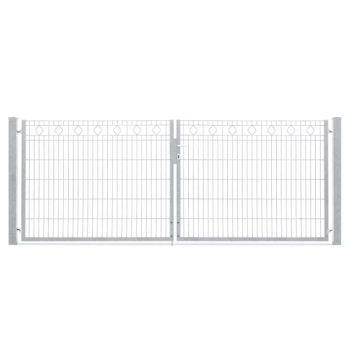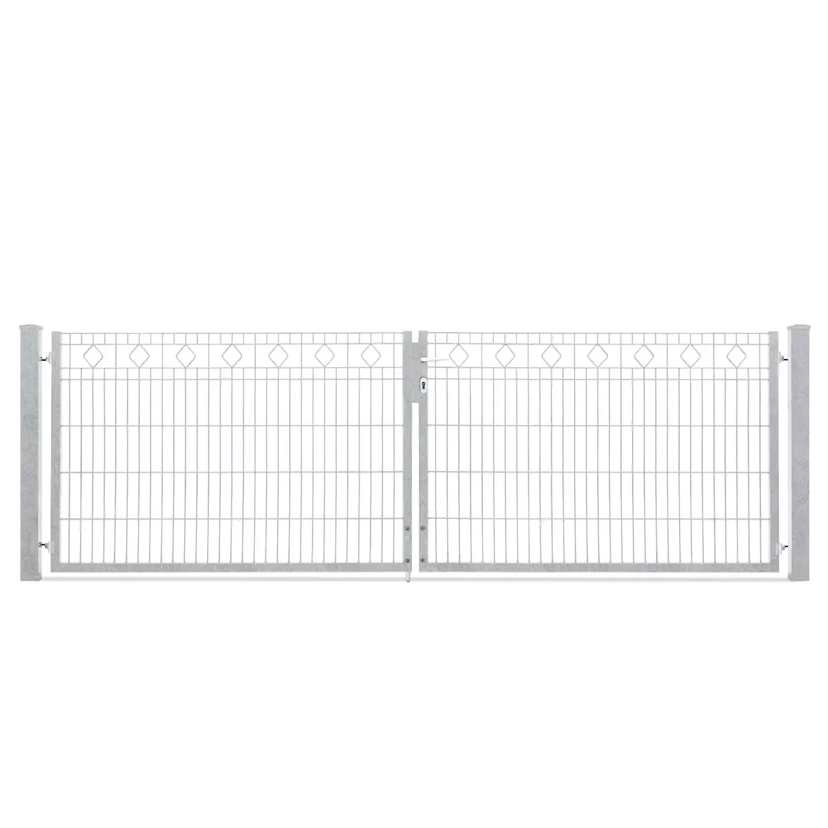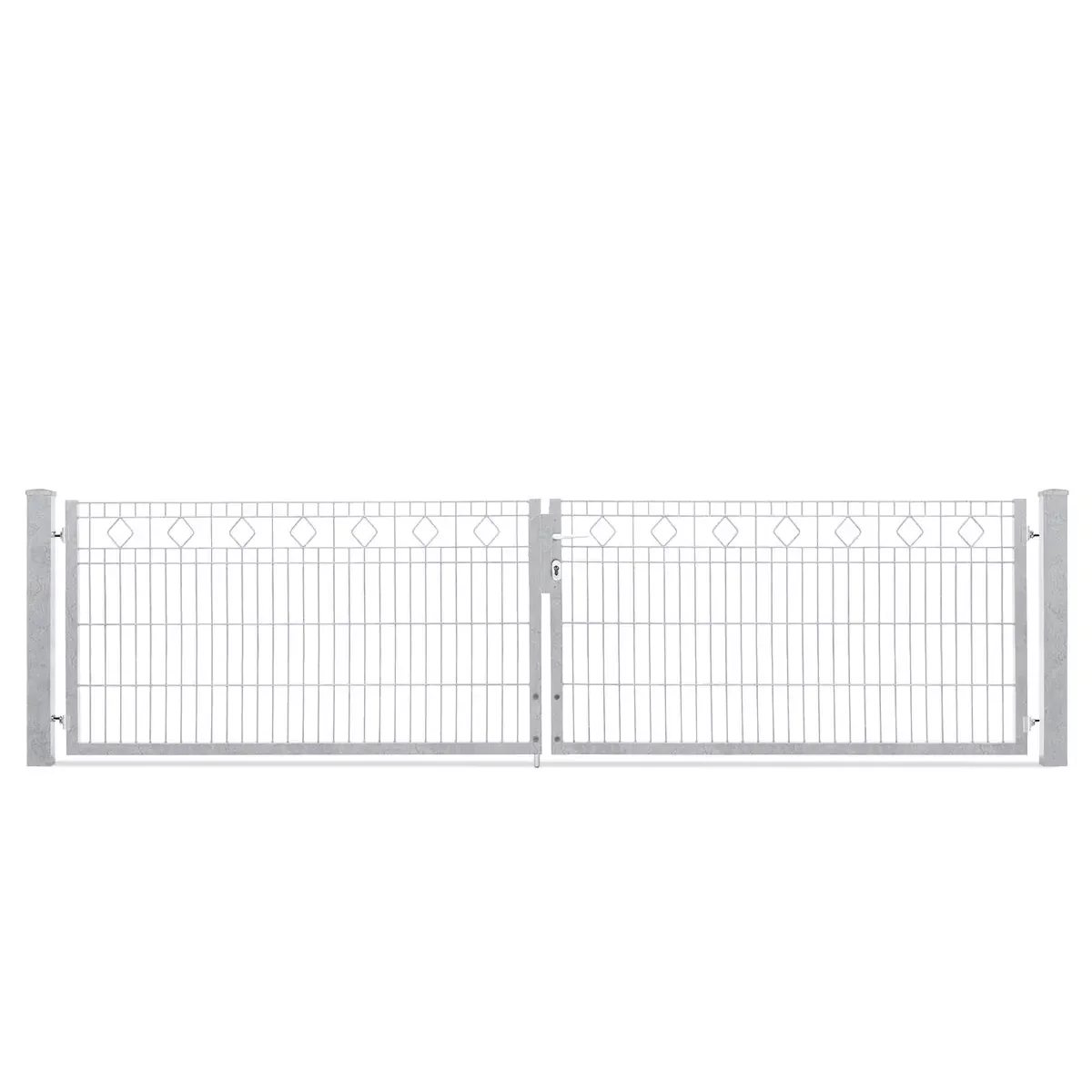 Das Tor besteht aus einer hochwertigen Doppelstabgitter-Konstruktion mit einer Schmuckzaunfüllung für zusätzliche Stabilität.