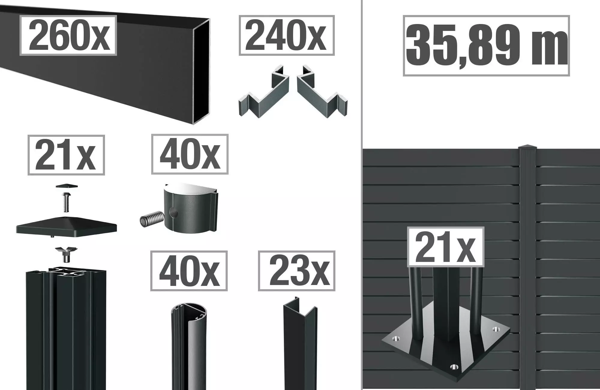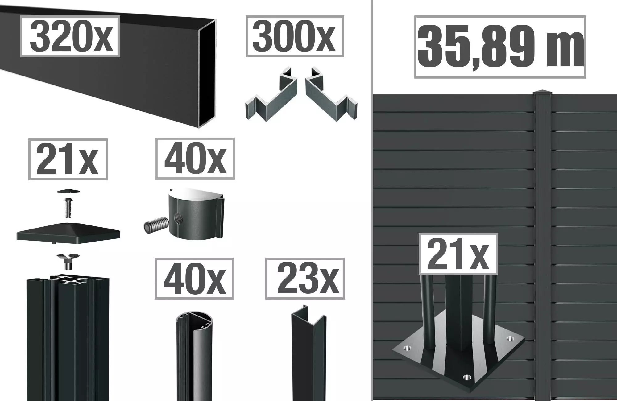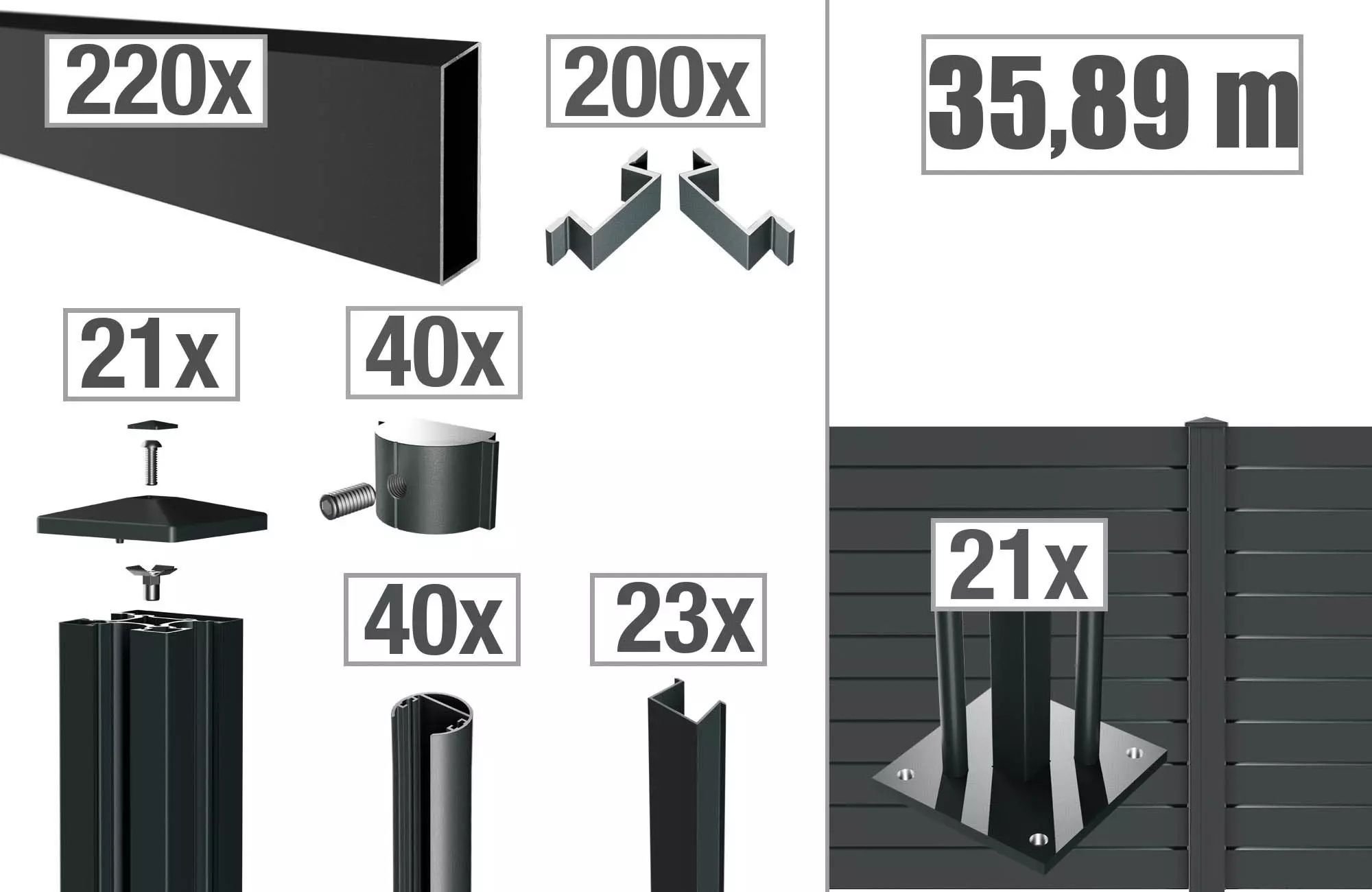 VIDUAL pure 100 Zaunpakete ***weitere Paketlängen auf Anfrage*** Die präzise gestalteten Rhombusformen schaffen ein harmonisches Gesamtbild und sorgen für eine ansprechende Ästhetik. Erhältlich in der Höhe von 100 x 20 mm und pulverbeschichtet in RAL7016 Feinstruktur, bietet dieses Profil nicht nur eine ansprechende Sichschutzlösung, sondern auch mehr Privatsphäre, da bei Betrachtung des Zaunelements auf Augenhöhe kein Durchsehen des Spaltes möglich ist. Die Spalthöhe beträgt 9 mm. Das Zaunpaket besteht aus folgenden Komponenten: Paneele pure 100 Pfosten 90/90mm inkl. Abdeckkappen, End-Nutensteinen und Distanzstücken 9mm Profiladapter ** Abdeckleisten ** Variante zum Aufdübeln: inkl. Fußplatten 90×90 mm bzw. 150×150 mm (ab Höhe 1400 mm) 1x Innensechskantschlüssel 4,0 und 5,5 Zaunfeldhöhe von 990 bis 1760mm Gesamtlängen mit Pfosten von 1880 bis 35890mm Aluminium und pulverbeschichtet RAL7016FS (Anthrazitgrau Feinstruktur) oder Aluminium foliert in Dark Oak ** Artikel müssen ggf. bauseits gekürzt werden ***sollte die von Ihnen gewünschte Paketzaunlänge nicht dabei sein, kontaktieren Sie uns bitte.