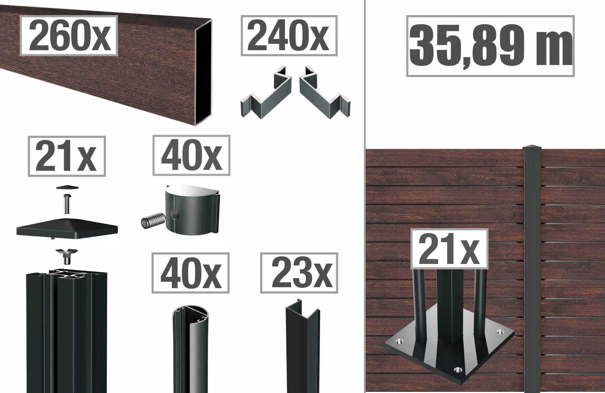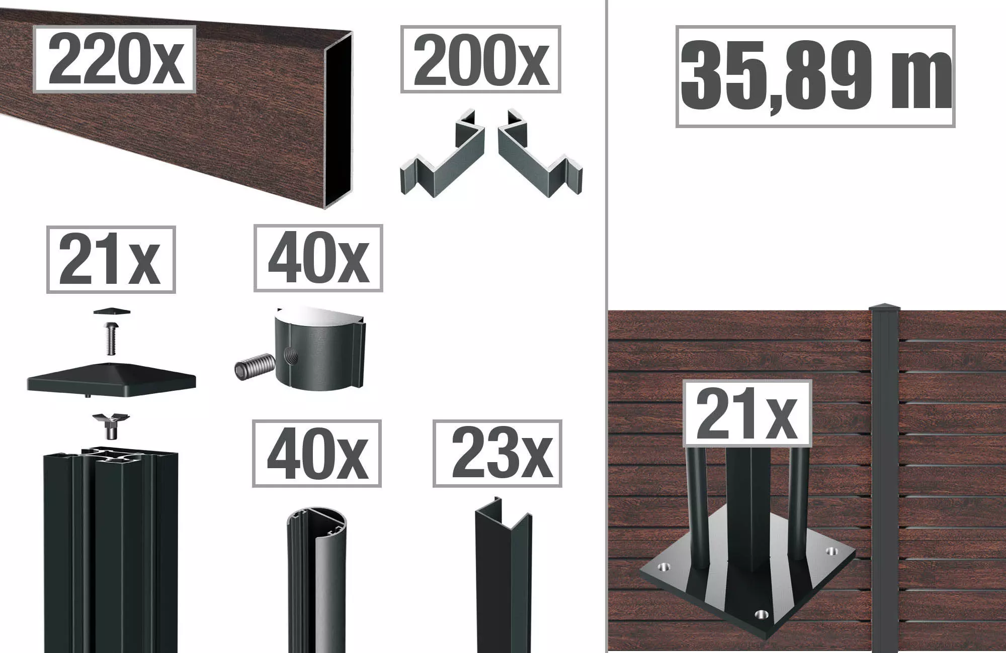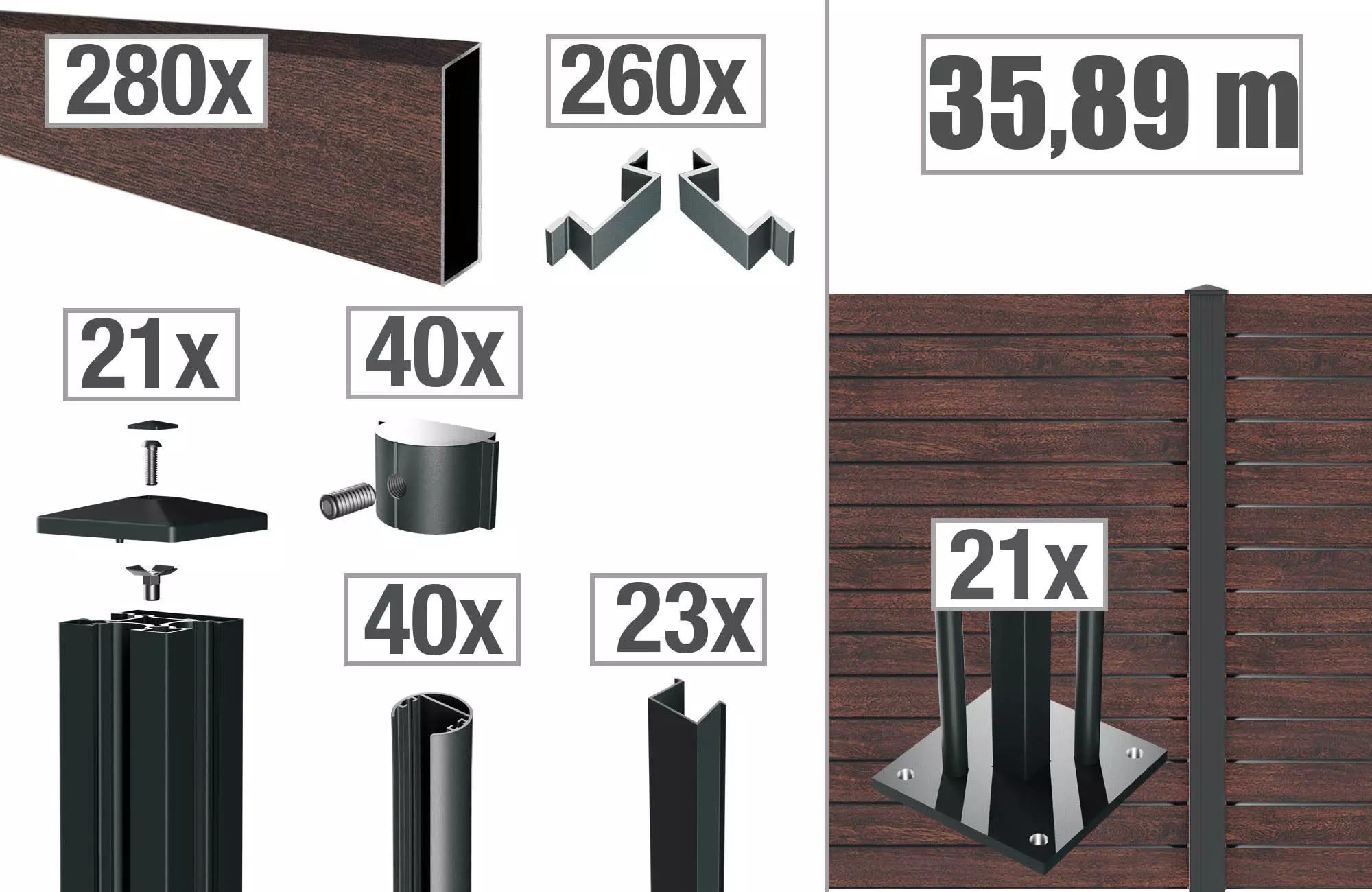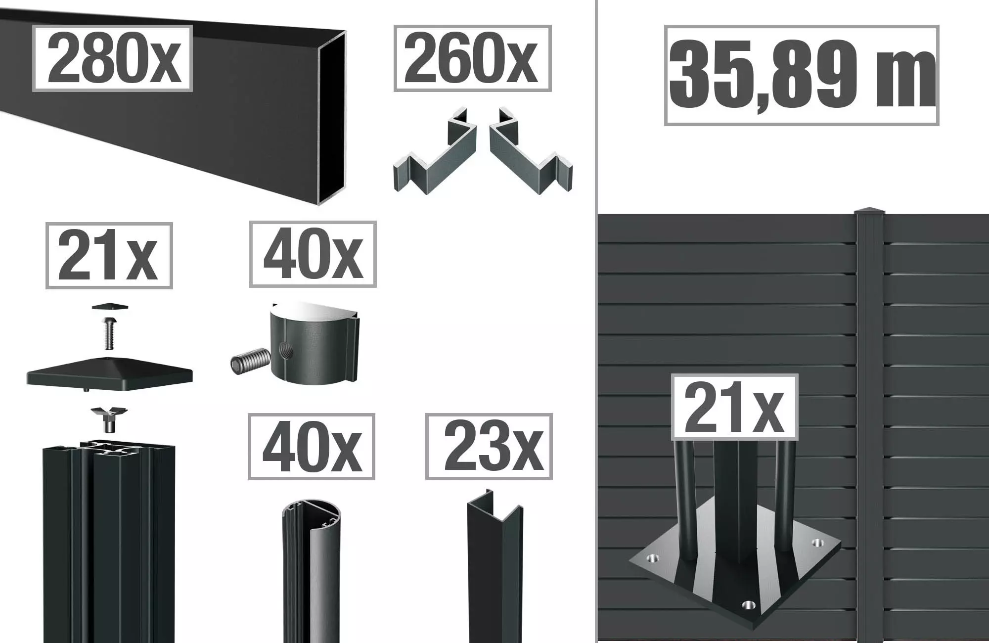 VIDUAL pure 100 Zaunpakete ***weitere Paketlängen auf Anfrage*** Die präzise gestalteten Rhombusformen schaffen ein harmonisches Gesamtbild und sorgen für eine ansprechende Ästhetik. Erhältlich in der Höhe von 100 x 20 mm und pulverbeschichtet in RAL7016 Feinstruktur, bietet dieses Profil nicht nur eine ansprechende Sichschutzlösung, sondern auch mehr Privatsphäre, da bei Betrachtung des Zaunelements auf Augenhöhe kein Durchsehen des Spaltes möglich ist. Die Spalthöhe beträgt 9 mm. Das Zaunpaket besteht aus folgenden Komponenten: Paneele pure 100 Pfosten 90/90mm inkl. Abdeckkappen, End-Nutensteinen und Distanzstücken 9mm Profiladapter ** Abdeckleisten ** Variante zum Aufdübeln: inkl. Fußplatten 90×90 mm bzw. 150×150 mm (ab Höhe 1400 mm) 1x Innensechskantschlüssel 4,0 und 5,5 Zaunfeldhöhe von 990 bis 1760mm Gesamtlängen mit Pfosten von 1880 bis 35890mm Aluminium und pulverbeschichtet RAL7016FS (Anthrazitgrau Feinstruktur) oder Aluminium foliert in Dark Oak ** Artikel müssen ggf. bauseits gekürzt werden ***sollte die von Ihnen gewünschte Paketzaunlänge nicht dabei sein, kontaktieren Sie uns bitte.