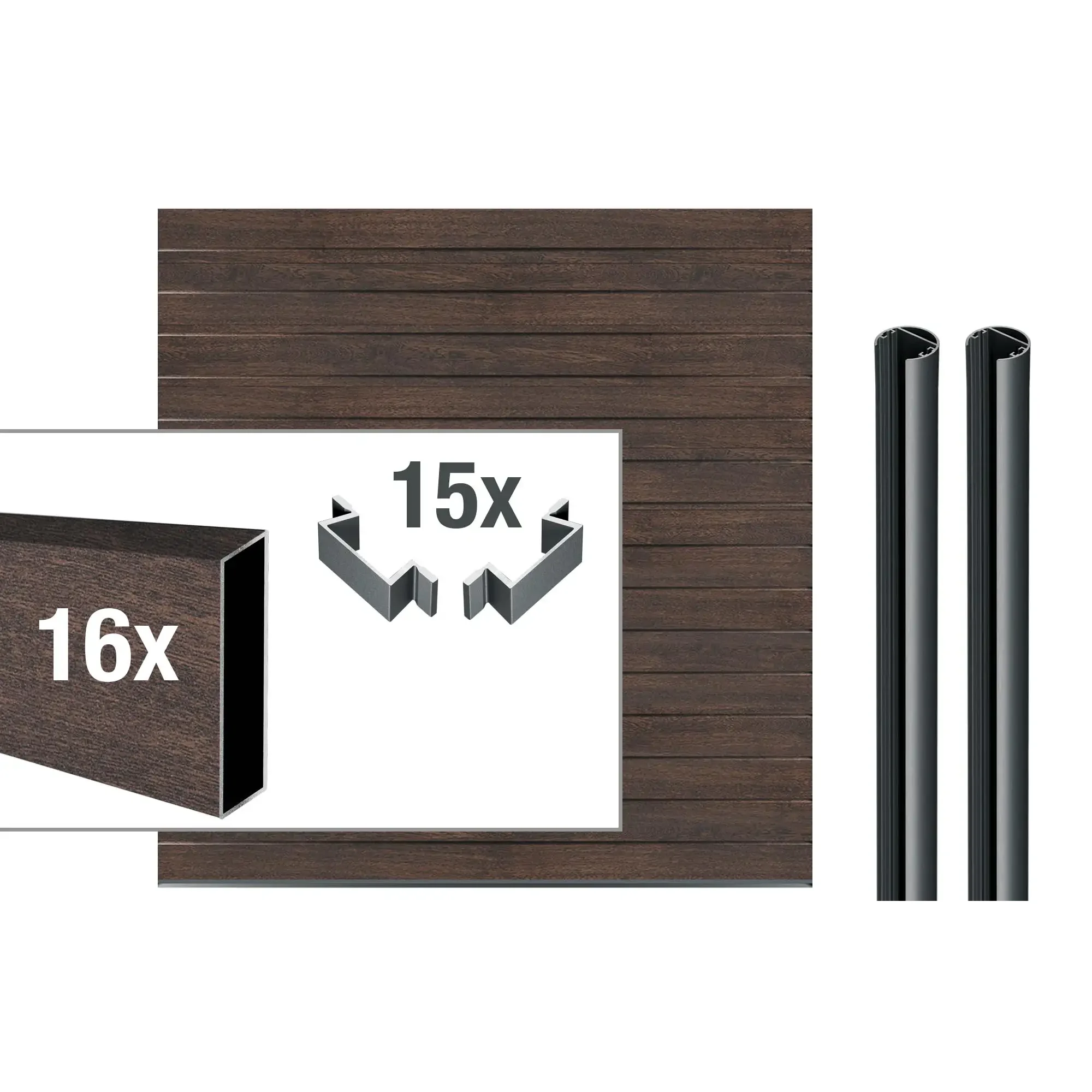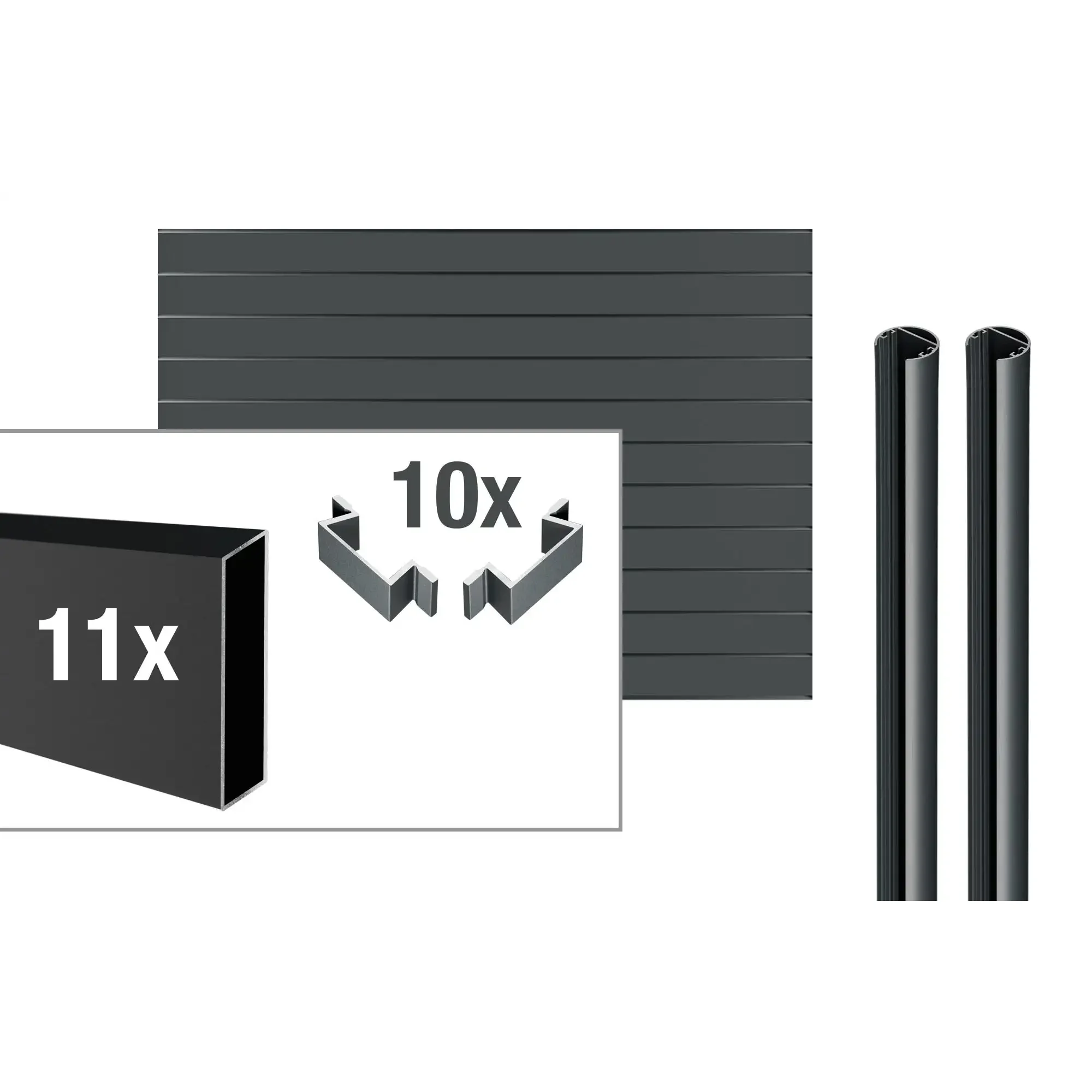 Im Lieferumfang sind die Aluminiumzaun-Zaunmatte, Profiladapter und Distanzstücke enthalten, die eine unkomplizierte Montage ermöglichen.